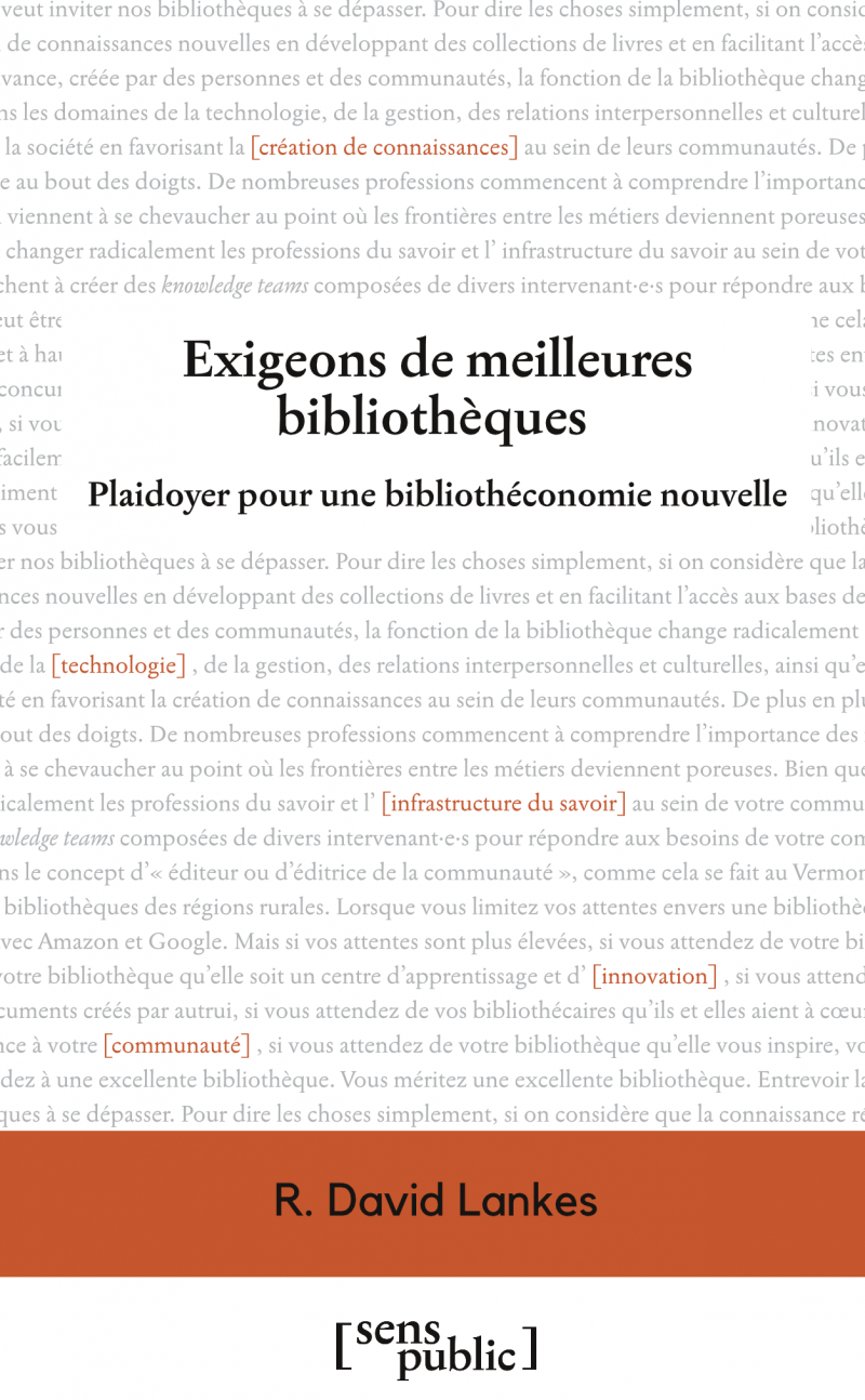 "Exigeons de meilleures bibliothèques. Plaidoyer pour une bibliothéconomie nouvelle", R. David Lankes, trad. collective sous la dir. de Jean-Michel Lapointe, Montréal, Sens public, 2018